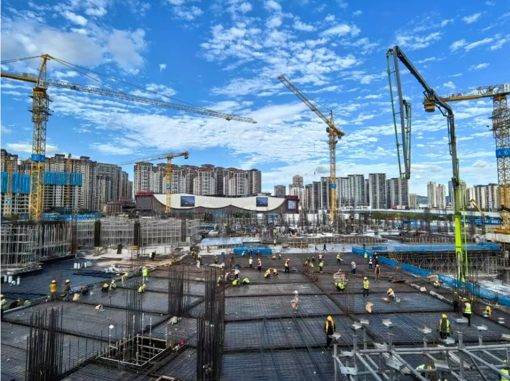在泉州演艺剧场综合体及商业配套街区项目施工现场,机器轰鸣、车辆往来穿梭,施工人员分布在各个区域有序作业,演艺剧场、商业街区、酒店等三个区域同步施工,呈现一片热火朝天景象。目前,该项目三个区域均在进行主体结构施工。节前,项目部提前部署人员力量,节假日期间每天均有约750名施工人员在场作业,确保项目建设按计划有序、快速推进。