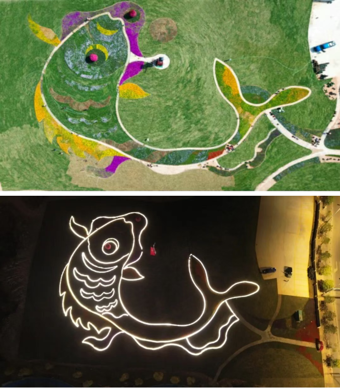在鲤城万达广场旁,一方草坡被各色花卉层层叠叠铺满,粉紫黄白的花浪随风摇曳,漫步其间可见红风车伫立坡顶,与缤纷花海相映成趣。从高空俯瞰,这处花海宛若一条灵动的鲤鱼;夜幕降临,创意灯光次第亮起,光影勾勒出鲤鱼游弋的模样,将年味与浪漫拉满。