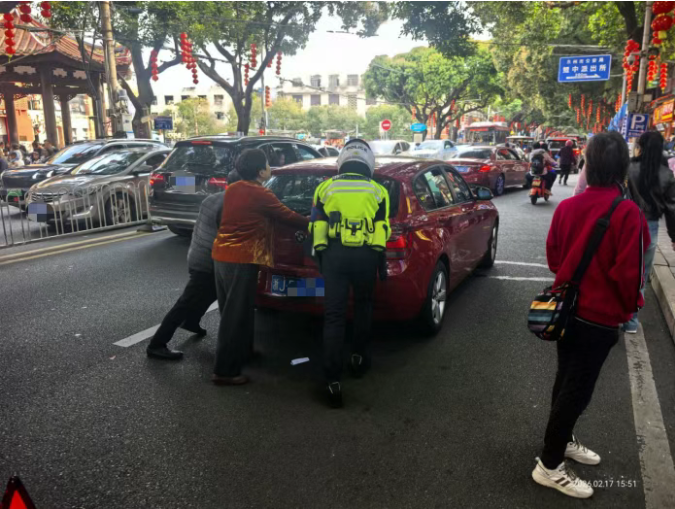 小车突发故障无法启动,铁骑队员发现后上前援手,合力将车辆推移至安全区域,避免影响主干道通行,随后帮忙联系、引导拖车前来救援。