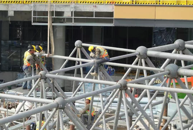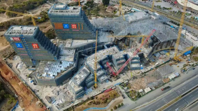 在“海丝号”综合体项目建设现场,塔吊林立、机器轰鸣,350余名施工人员分布在各个区域有序作业,呈现出一派繁忙的建设场景。据了解,项目于2月18日(农历正月初二)恢复建设,目前已进入钢结构工程、幕墙装修、机电综合管道安装、室内装修并行推进的关键阶段,砌体结构施工即将收尾。