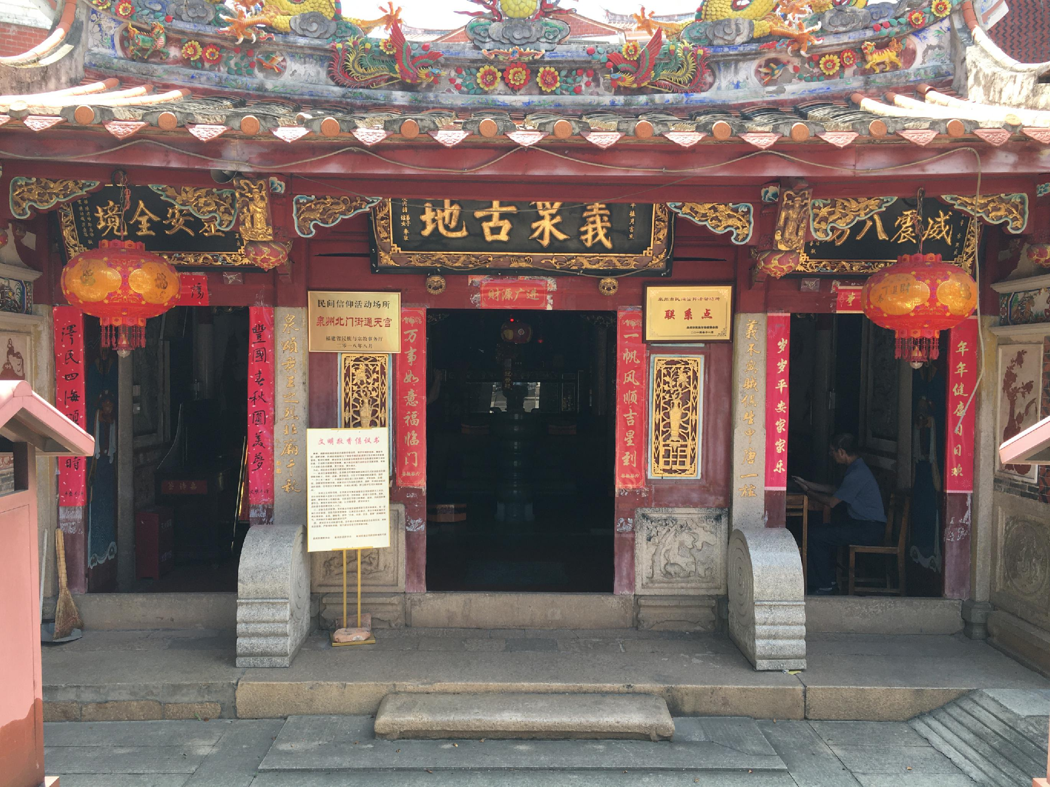 【通天宫】(泉山社区北门街通天巷)。泉俗崇敬精忠贞烈历史人物。通天宫始建于宋,祀平息安史之乱的忠勇将军唐武安王张巡,右侧“戊子元魁坊”石匾额,系明嘉靖七年(戊子年,1528年)泉州府同安刘汝南乡试夺魁原坊旧物。原有宋石经幢一座,1986年移置承天寺。