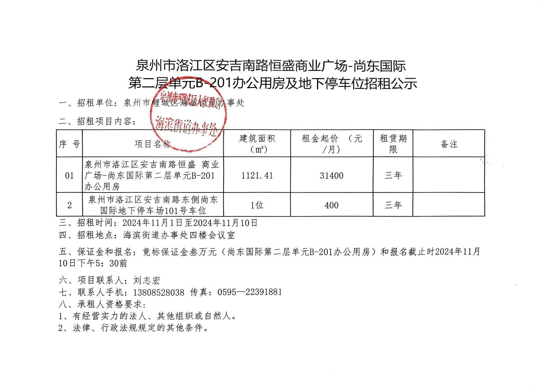 泉州市洛江区安吉南路恒盛商业广场尚东国际第二层单元B-201办公用房及地下停车位招租公示