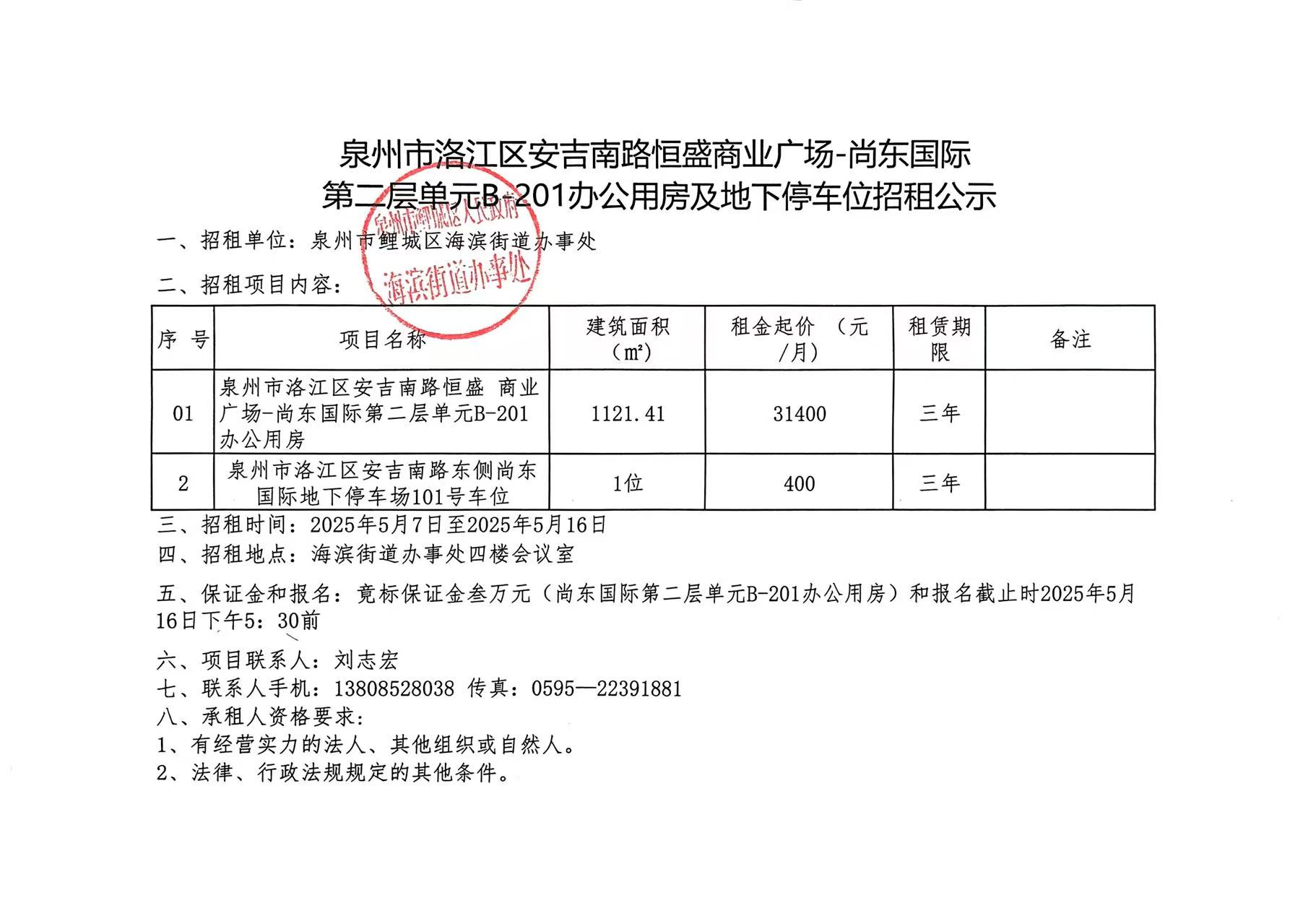 泉州市洛江区安吉南路恒盛商业广场--尚东国际第二层单元B-201办公用房及地下停车招租公示