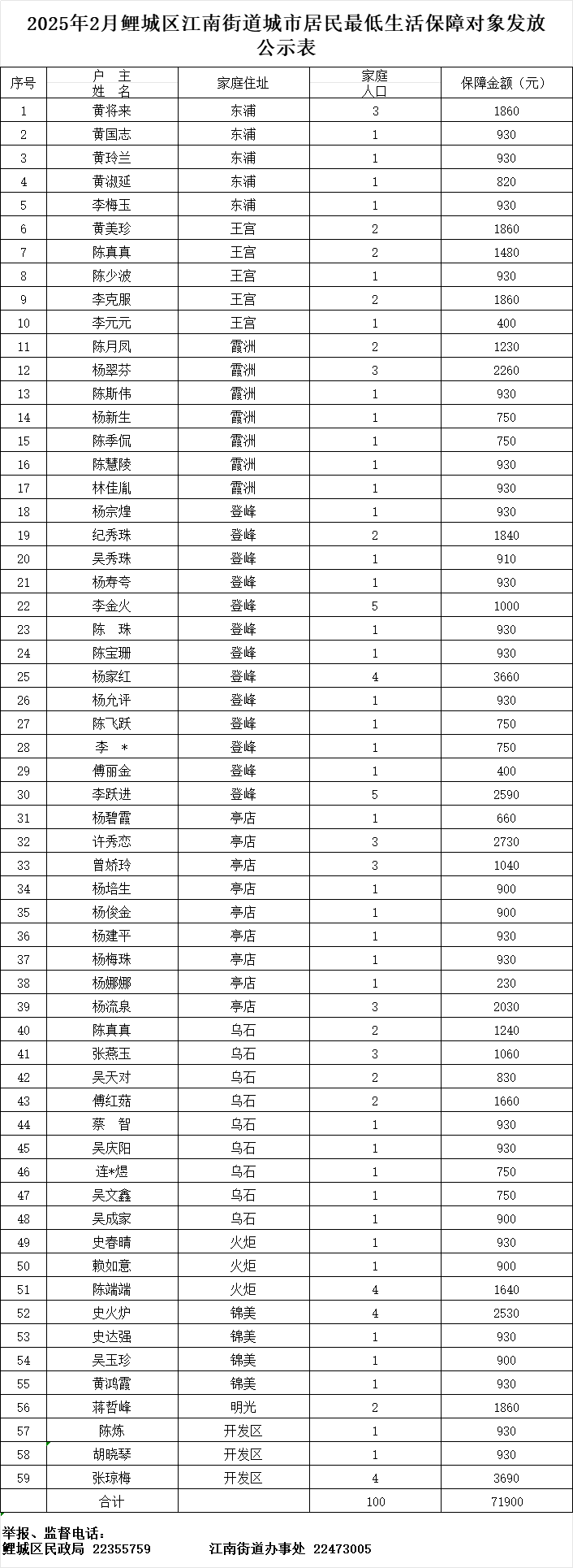 江南街道2025年2月发放低保花名册
